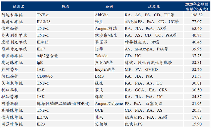图:全球TOP100销售额药品中自身免疫及炎症药物的适应症和销售情况