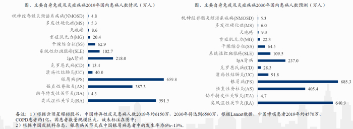 根据2019年发表在Lancet上的大规模CPH Study数据显示,我国20岁及以上人群哮喘(Asthma)患病率4.2%,患病人数达到4570万。根据2018年发表在Lancet的中国慢性阻塞性肺病(COPD)的流行状况与危险因素研究,中国COPD患者人数约1亿。除此之外,常见的自免疾病中,以类风关、银屑病、强直性脊柱炎、IgA肾病、系统性红斑狼疮五类病变较为常见,2019年合计约2000万患者。根据弗若斯特莎莉文预计,2030年,我国自免疾病结构分布仍将保持。