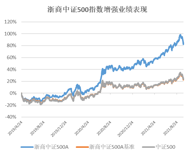 备注:浙商中证500增强成立于2019年04月24日,根据产品定期报告数据显示,2019年、2020年、2021年上半年净值增长表现/同期业绩比较基准收益率分别为2.82% (-6.01%)、42.98%(19.94%)、19.04%( 6.61%),产品业绩比较基准为中证500指数收益率×95%+银行活期存款利率(税后)×5%。浙商中证500指数增强于2021年8月3日增聘基金经理胡羿。
