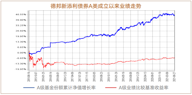 业绩/基准:德邦新添利于2015年6月19日成立,C类份额2016年2月17日增加,2015年A类5.74%/-8.83%,2016年A类6.30%/-6.86%,C类49.10%/2.26%,2017年A类6.88%/-1.08%,C类6.77%/-1.08%,2018年A类1.16%/1.51%,C类0.81%/1.51%,2019年A类12.04%/4.53%,C类11.61%/4.53%,2020年A类7.41%/2.62%,C类6.99%/2.62%,2021年上半年A类-0.30%/0.70%,C类-0.49%/0.70%,成立以来A类45.81%/8.98%,C类92.24%/10.92%。特别说明:德邦新添利债券型证券投资基金由德邦新添利灵活配置混合型证券投资基金(基金合同生效日2015/6/19)转型而来,《德邦新添利债券型证券投资基金基金合同》于2016年7月28日正式生效,转型后基金的投资目标、投资范围、投资策略均发生改变,具体改变请投资者仔细阅读基金的《基金合同》及《招募说明书》等法律文件,了解基金的具体情况。本基金自成立以来基金经理变更情况:何晶先生,2015年6月19日至2015年9月11日管理本基金。许文波先生,2015年8月12日至2018年3月22日管理本基金。丁孙楠女士,2017年1月24日至今管理本基金。黎莹女士,2018年3月21日至今管理本基金。丁孙楠管理的同类型基金德邦短债债券基金于2019年12月25日成立,2020年A类1.99%/2.48%,C类1.78%/2.48%,2021年上半年A类1.50%/1.53%,C类1.38%/1.53%,成立以来A类3.56%/4.18%,C类3.22%/4.18%。
