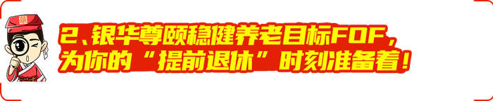 当然,想要“提前退休”、“体面养老”,努力做好现在的工作肯定是必不可少的。不过,也还有一些方法能为你的“养老”理想助力一番。比如就是目前小华家正在发行的——银华尊颐稳健养老目标一年持有期FOF(012038)。