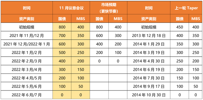 本轮Taper相较2013年12月-2014年11月Taper更为平滑,上次每次议息会议缩减购债100亿,本次每月缩减100亿,当然,本次起始规模1200亿大于上次的850亿的,如果只在议息会议缩减,那势必节奏要更快,单次缩减规模更大。