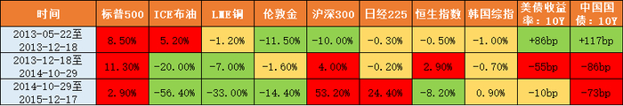 美国退出量化宽松将导致短期流动性收紧,石油、有色金属等利率敏感型商品将可能持续释放风险;同时,大宗商品是用美元计价的,而美元因为QE的结束而在升值。在前述美联储第三轮量化宽松退出至加息前的时间段内,布伦特原油价格跌幅高达56%。黄金、白银等贵金属价格在2013年大跌,跌幅明显大于其它大宗商品。