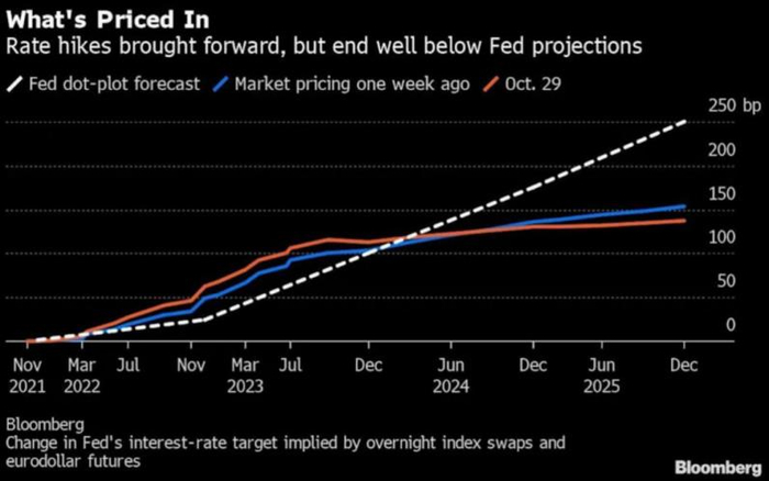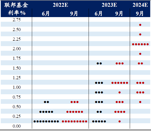 11月议息决议并不会公布经济预期以及点阵图,美联储9月点阵图显示,预计2022年底前美联储首次加息的看法各占一半(此前预期2023年底前首次加息);9名委员预计美联储将在2022年开始加息,占总委员数量一半;其中,6名委员预计2022年加息一次,3名委员预计2022年加息两次;除一名委员外其余所有委员均预计在2023年开始加息(今年6月为13名委员)。