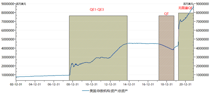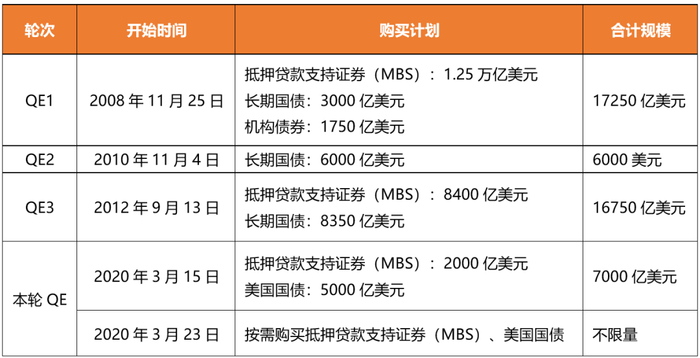 本轮QE主要是受新冠疫情影响,2020年3月15日(美东时间),美联储宣布紧急降息100个基点,联邦基金利率从1%-1.25%降至0-0.25%,并推出7000亿美元规模的量化宽松计划,购买5000亿美元的国债以及2000亿美元的抵押担保证券,以缓解因疫情爆发而导致的市场动荡。