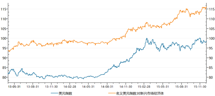 相比之下,QE的谢幕影响冲击较大的是新兴市场国家和大宗商品市场,在QE开启阶段,联储向市场和金融机构注入过多的美元流动性,美元呈现贬值,投资者纷纷把大量的资金投入到本国的资本市场、房地产市场外,还有大量的热钱涌入新兴市场国家的资本市场。从企业债券到新兴国家弥补赤字,短期会享受美元滥发带来的“红利”。而当QE结束,尤其伴随联储加息,美元开始升值,通常会刺激美元从新兴市场国家回流,由于薄弱的产业基础、外向型经济、过度负债和紧盯美元的汇率制度,从而对新兴市场形成较大的冲击,往往意味着新兴市场国家资本市场动荡,汇率贬值,甚至引发主权债务危机。