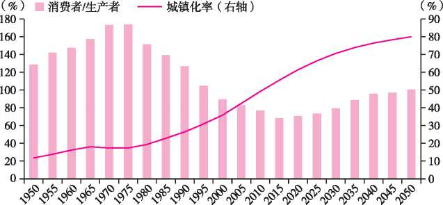 图3 我国消费者/生产者比例及城镇化率