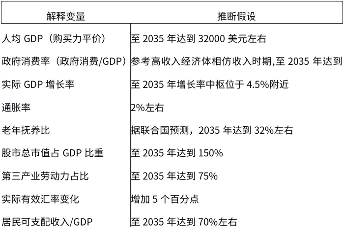 为了给未来长期的消费总量增长提供量化参考,我们以郭凯等人(Guo and N'Diaye,2010)的跨国计量统计模型为基础,对2035年的居民消费率(居民消费/GDP)做估算,然后辅以对2020—2035年实际GDP增长率的判断,推算出