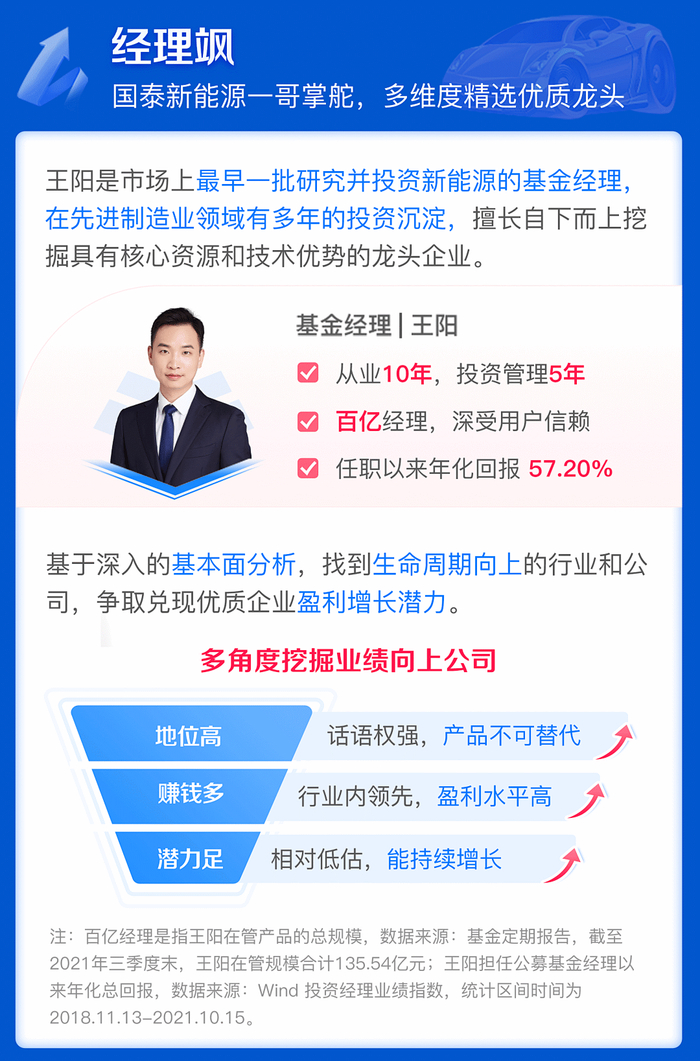 王阳目前在管基金包括国泰智能汽车A/C、国泰智能装备A/C、国泰价值精选A/C、国泰价值先锋A/C。王阳在管成立超6个月产品及业绩如下:国泰智能汽车A成立于2017.8.1,王阳任职时间为2018.11.13,基金2017-2021年上半年基金业绩增长率/业绩基准(%):-1.60/-3.07,-28.25/-30.35,53.26/36.96,112.38/78.55,21.28/22.60。国泰智能装备A成立于2017.6.21,王阳任职时间为2018.11.13,基金2017-2021上半年基金业绩增长率/业绩基准(%):11.70/5.84,-22.47/-28.90,45.50/34.81,97.22/39.85,11.71/6.63,11.71/6.63。国泰价值精选A成立于2018.8.8,王阳任职时间为2019.8.15,2018-2021年上半年基金业绩增长率/业绩基准(%):-8.77/-4.56,65.55/18.01,66.84/16.24,4.78/0.70。数据来源:基金定期报告。