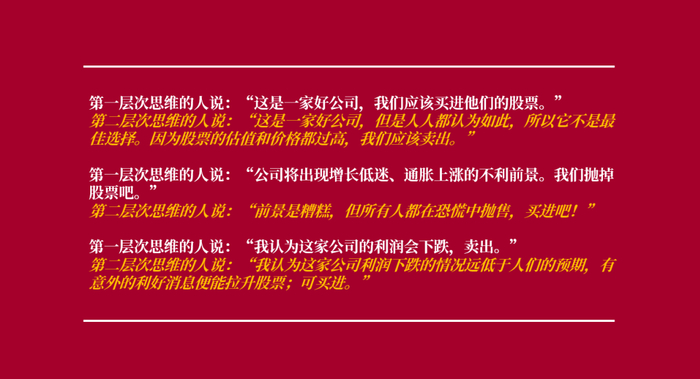 通过上面的例子不难发现,第一层次思维者看到的是表面,单纯地对表面现象作出反应;第二层思维者看到的是更深层次的、全面的情况,反复思考各种情况的可能性后作出决策。