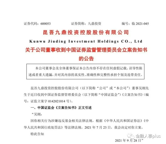 今年9月29日,九鼎投资发公告称,近日收到中国证监会《立案告知书》。因吴刚相关行为涉嫌违反基金相关法律法规,7月23日,证监会决定对其立案。公告还称,本次立案所涉事项系对吴刚先生个人的调查。