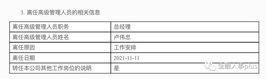 11月13日,九泰基金发布公告,总经理卢伟忠因工作安排离任,总经理一职由董事长王彦斌代任。