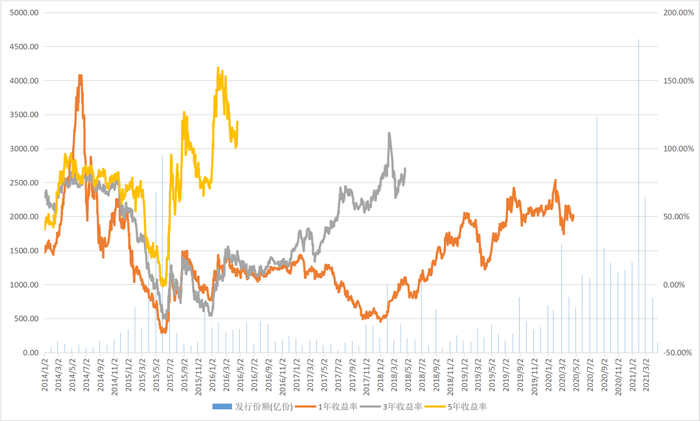 如下图所示,统计2014年以来权益类基金每月的发行份额(柱状图),以及2014年以来任意一个交易日买入偏股混合型基金指数的近1年、近3年、近5年平均收益率(折线图)。通过对比,我们能得出什么结论?