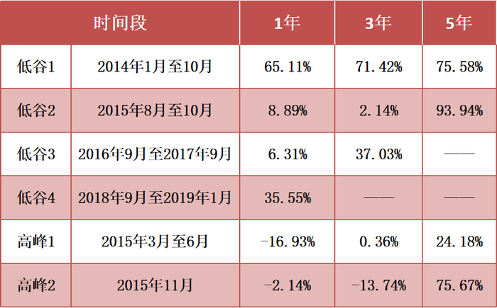 通过上面的发行份额(柱状图)的走势,可以发现几个比较明显的权益基金发行低谷期、高峰期。在这些阶段买入偏股混合型基金指数的近1年、3年、5年的平均收益率如下表: