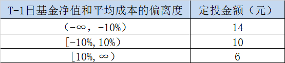根据扣款前一交易日(T-1日)的基金净值和平均成本的差距(偏离度)来确定每期定投金额。基金净值低于平均成本时,增加定投金额;基金净值高于平均成本时,减少定投金额。这样做能使平均成本在市场下跌时较快下降,在市场上升时较慢上升。