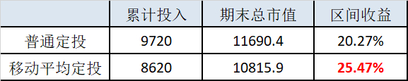 定投四年,普通定投(每日10元)累计投入共计9720元,移动平均策略定投累计投入8620元。截止2021.11.1,两种策略的累计定投收益如下: