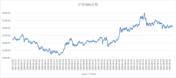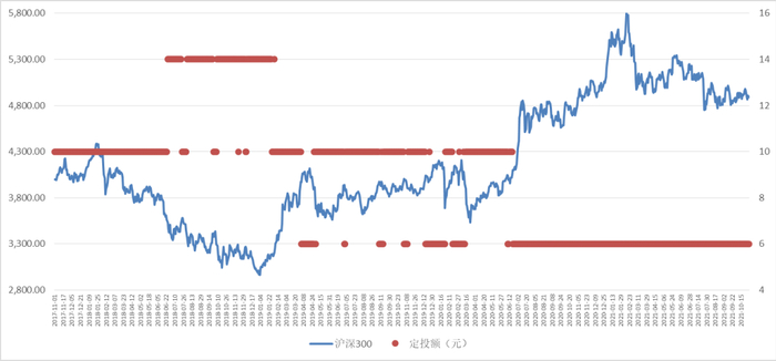 数据区间:2017.11.1-2021.11.1。左轴为沪深300指数;右轴为每期定额额,单位元。