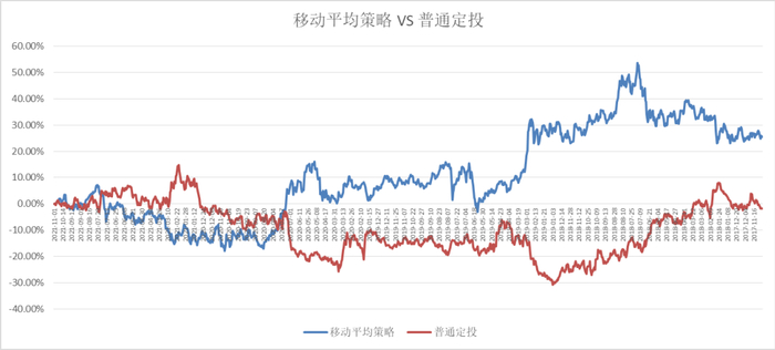 移动平均策略并不是说在每一时间点都能超越普通定投,但时间拉长,当累积了更多的便宜筹码,上升趋势中的收益会更胜一筹!