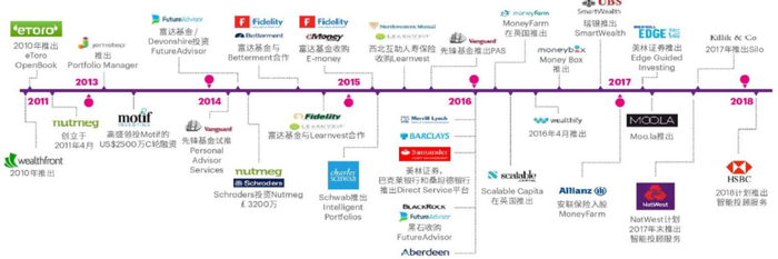 在智能投顾鼻祖Betterment于2008年成立后,2010年Wealth Front成立,同年Betterment正式上线了智能投顾业务,投顾业务从此进入了传统投顾与人工智能相结合的新阶段。2014年Vanguard 推出旗下的智能投顾平台 VPAS、2015年富达基金开始了一系列与智能投顾创业公司之间的合作与并购活动、2016年美林证券、巴克莱银行等推出数字服务平台,越来越多的传统金融机构开始试水智能投顾领域,形成了传统投顾与智能投顾协同发展的局面。根据 Backend Benchmarking 的统计,截止2019年6月30日,其跟踪的42家智能投顾管理人共管理资产4400亿美元,其中管理规模最大的是 Vanguard,其智能投顾业务的规模达到了1400亿美元。