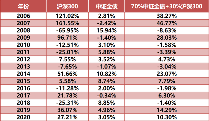 Wind数据显示,在沪深300指数大跌65.95%的2008年,经过股债配置的组合年度亏损缩窄至8.63%,而在2008年之外的年份,投资组合的最大年度亏损不超过4%。可见,该组合兼顾了收益率与波动率的优势,整体收益较为平稳且波动相对沪深300较小。