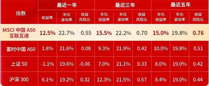 Wind数据显示,MSCI中国A50互联互通指数最近一年的收益率、和最近三年、最近五年的年化收益率都超过了10%;年化波动率与其他几个宽基指数的年化波动率相当,收益风险比较高。