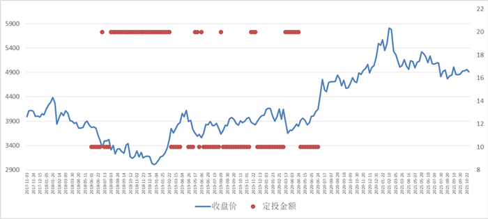 数据区间:2017.11.1-2021.11.1。左轴为沪深300指数;右轴为每期定额额,单位元。