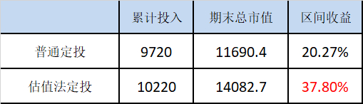 定投四年,普通定投(每日10元)累计投入共计9720元,估值定投策略投入10220元。截止2021.11.1,两种策略的累计定投收益如下: