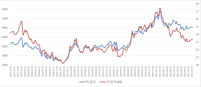 时间区间2017.11.1-2021.11.1的市盈率统计中,PE市盈率的平均值为13.12,最大值为17.45,最小值为10.23,20%分位点为11.75,中位数为12.74,80%分位点为14.58。