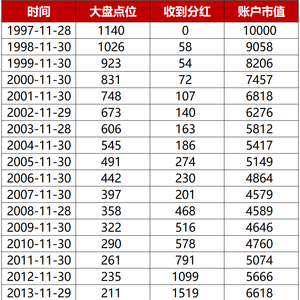 数据说明:大盘点位根据1997年11月28日上证指数实际数据(来自Wind)按照每年10%的跌幅假设进行计算,分红数据为1997.11.28-2021.11.30期间上证指数成分股实际分红款,分红款按指数当天ttm股息率推算得出,为便于计算,假设成分股均在每年11月最后一个工作日统一派发红利,分红款以当日收盘价再次买入上证指数。