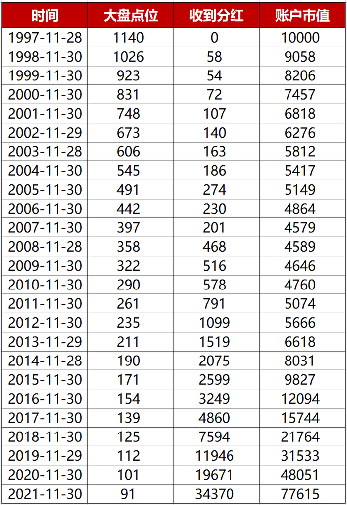 24年后,大盘点位跌到91点,但是因为每年的红利再投,你的账户市值却从1万变成了7.7万,非但没有赔钱还赚钱了。