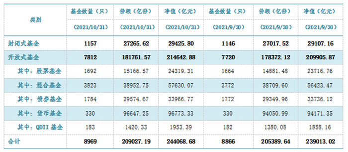 与此同时,公募基金行业也迎来了扩容期。据中国证券投资基金业协会数据显示,截至2021年10月底,我国境内共有基金管理公司137家,取得公募基金管理资格的证券公司或证券公司资产管理子公司12家、保险资产管理公司2家;以上机构管理的公募基金产品数量合计8969只,资产净值合计24.41万亿元。