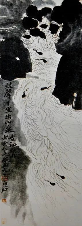 这幅《蛙声十里出山泉》是齐白石为作家老舍画的一张水墨画。虽然画面中看不见一只青蛙,但通过顺流而下的蝌蚪,观众们也能想象出青蛙妈妈在下游的呼唤。倒是异常契合《小蝌蚪找妈妈》的主题。