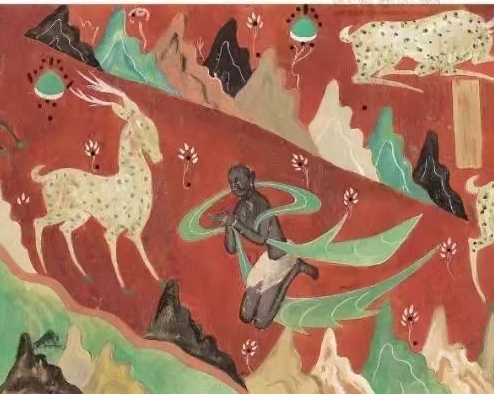 北魏·莫高窟第257窟壁画(临摹) 图源:常书鸿除了将鹿王身上的点状花纹换成月牙形,动画几乎完全还原了壁画——整个画面以人物为主,土红色的大地衬以山石树木,有浓厚的装饰风格。甚至于路边的花草,也都一模一样。