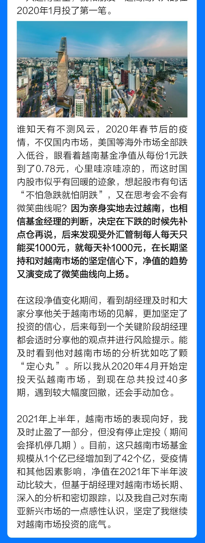 分享 | 在国际市场里狩猎“金山银海” 市场资讯 2021.12.16 19:18 身为十余年的老基民,真正开始深入了解基金却是退休之后。偶然的机会到越南旅游,被这个“金山银海”的国家吸引,回国后念念不忘一路找寻越南的投资机会。今天,一起跟随丸子走进弘粉@肖姐 的投资故事。 加载中... 视频 直播 美图 博客 看点 政务 搞笑 八卦 情感 旅游 佛学 众测