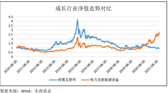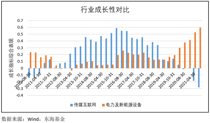 从成长指标的综合表现比较可以看到,传媒互联网行业在2012年到2018年始终处于高速增长期,具有明显的成长风格属性,但从2019年开始迅速衰落,直到当前的成长表现依然很弱。相反,电力及新能源设备则在2016年以后开始出现成长风格特性,且成长性从2019年开始迅速加强。