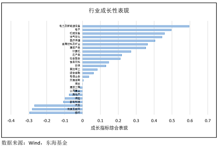 如上图,可见当前电力及新能源设备、电子、机械设备、油气石化、医疗保健等行业的成长性较高,而银行、传媒互联网、汽车、家电、保险等行业的成长性较低。