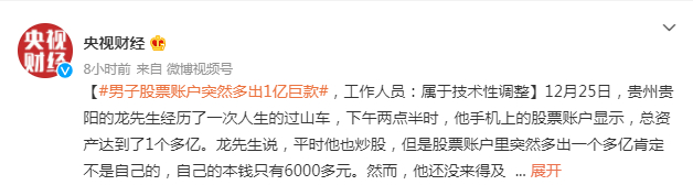 据央视财经27日晚间消息,12月25日,贵州贵阳的龙先生经历了一次人生的过山车,下午两点半时,他手机上的股票账户显示,总资产达到了1个多亿。