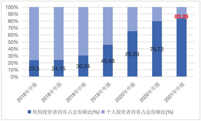 曹文俊践行均衡策略,让其产品的配置价值日益凸显,据基金定期报告数据显示,曹文俊所管理的富国转型机遇,机构投资者占比从2018年中的23.5%,持续攀升,到2021年年中时,机构投资者比例达83%。