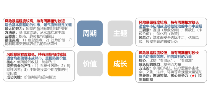 根据当前宏观经济所处的位置,以及对于未来流动性格局的判断,按照投资久期长短,和风险暴露高低,将股票分成价值、主题、周期、成长这4个象限,按照风险收益比特征,70%~80%主要集中在周期与成长。