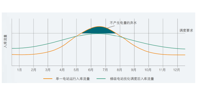 在介绍龙盘水电之前,我们先来看一下“梯级联合调度”的概念。大家都知道,由于流域内降雨和融雪等因素,长江的流量在一年之内存在汛期和枯水期的交替,而在年度之间,则有来水偏丰和来水偏枯年份的区别。因此,如果在一条河流上只修建一个水电站,那么这个水电站的发电情况就颇有“看天吃饭”的意思,上游来水多则多发,上游来水少则少发,在汛期,可能因为来水过多产生弃水,在枯水期可能出现无水可用的情况。而当在一条河流上修建多个梯级电站时,通过对上游水情的科学预测以及梯级水库之间流量的合理调度,能够达到“削峰填谷”的作用,平滑水电站的电力输出曲线。简单地来说,多个梯级电站的修建增加了整个流域水库的容量,而这种存水能力的“冗余”又可以在必要的时候转化为电力,从而达到提升水电站发电效率的作用。