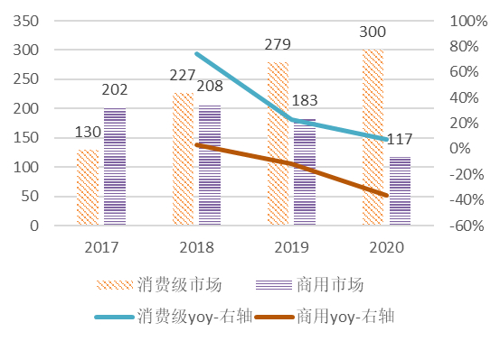 图:中国投影市场(消费级、商用)年出货台数(单位:万台)数据来源:IDC