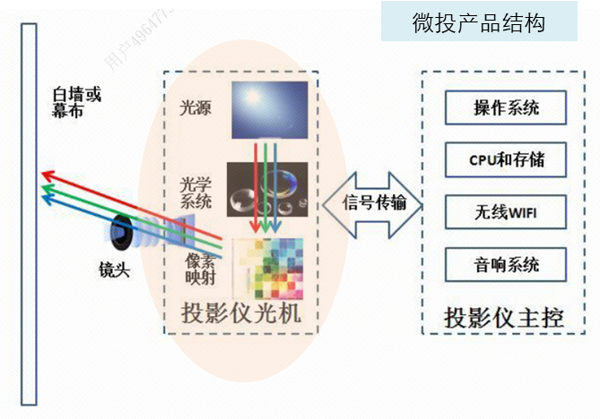 产品由三个模块组成,光源、光投射(镜头)、光调制(显示芯片),一般按照光机内技术单元的组合,有长焦LED光源投影(主流微投产品),和短焦激光光源投影(激光电视)这两种主要产品形态,其中我们探讨的智能微投更多指的是前者,也即LED光源的成熟投影产品。