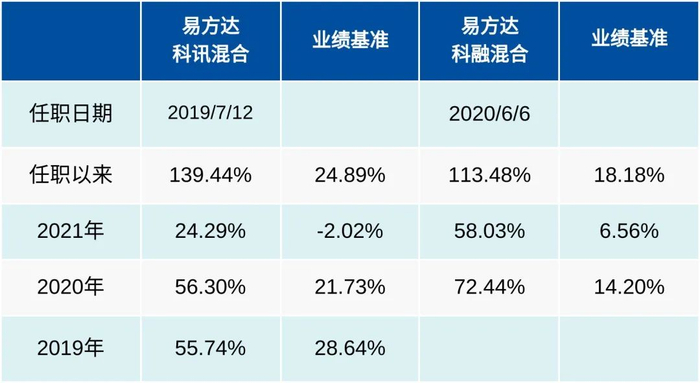 刘健维先生目前在管的两只基金:独立管理的代表作易方达科融混合(006553)、与陈皓先生联合管理的易方达科讯混合(110029),均表现喜人。