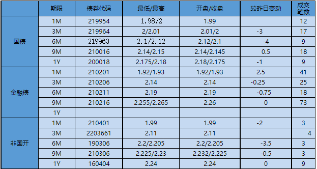 今天短利率交投一般,6M内个券收益多有下行,6M以上个券涨跌互现。