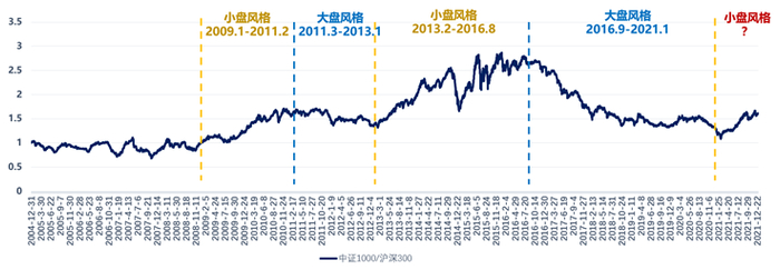 2009年后A股市场出现了明显的风格特征,经历了四轮大小盘风格切换。2021年春节后(2021.2.18-2021.12.23)代表大盘股的沪深300指数下跌14.79%,代表小盘股的中证1000指数上涨25.85%,小盘风格初见端倪。