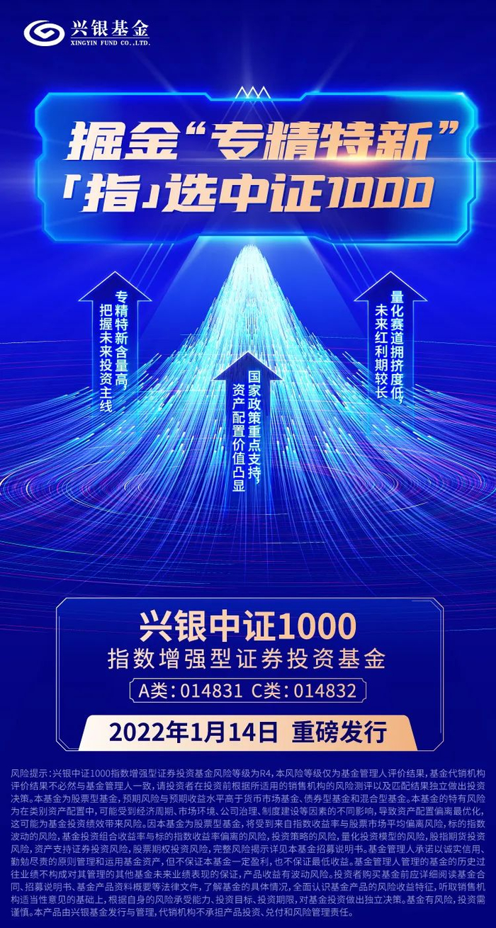 风险提示:兴银中证1000指数增强型证券投资基金风险等级为R4,本基金为股票型基金,预期风险与预期收益水平高于货币市场基金、债券型基金和混合型基金。兴银中证1000指数增强的特有风险为标的指数收益率与股票市场平均偏离风险,标的指数波动的风险,基金投资组合收益率与标的指数收益率偏离的风险,标的指数变更风险,跟踪误差控制未达约定目标的风险,指数编制机构停止服务的风险,成份股停牌的风险,本基金投资策略的风险,量化投资模型的风险,股指期货投资风险,资产支持证券投资风险,股票期权投资风险等风险,完整风险揭示详见本基金招募说明书。基金管理人承诺以诚实信用、勤勉尽责的原则管理和运用基金资产,但不保证本基金一定盈利,也不保证最低收益。基金管理人管理的基金的历史过往业绩不构成对其管理的其他基金未来业绩表现的保证,基金收益有波动风险。基金管理人提醒投资者购买本基金前应详细阅读基金合同、招募说明书和基金产品资料概要等法律文件,了解基金的具体情况,全面认识基金产品的风险收益特征,听取销售机构适当性意见的基础上,根据自身的风险承受能力、投资目标、投资期限,对基金投资做出独立决策。基金有风险,投资需谨慎。本产品由兴银基金管理有限公司发行与管理,代销机构不承担产品的投资、兑付和风险管理责任。