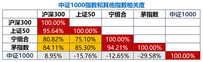 中证1000代表了市场热门指数中稀缺的中小盘风格,与其他热门指数如沪深500,上证50,宁组合,茅指数等的业绩走势相关度较低,配置中证1000,有助于降低组合的波动。