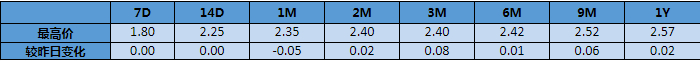 今日NCD交投情绪一般,成交集中在国股大行,早盘各期限存单价格依旧维持低位,1y存单相比昨日收盘小幅下行,随着资金面收紧各期限买盘减少收益上行,至尾盘1y存单回到昨天收盘位置;具体来看,明年1月底2.18,;3月底2.32;明年6月底2.35;明年9月底2.42,明年12月底2.465,明年1月到期2.49。
