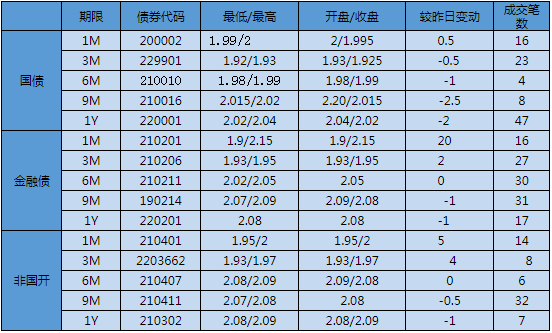 今日银行间短券交投情绪较为清淡,价格先下后上,早盘价格先下行2BP左右,下午情绪减弱,6M以内价格回调,全天来看6M内较昨日有1-3BP的上行,6M以上有1BP左右的下行。买盘主要关注二三季度到期好名字券种,买盘以基金为主。