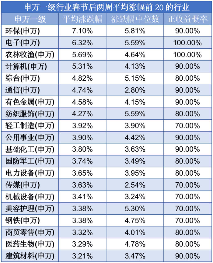 过去10年,春节后两周,31个行业中有30个行业平均涨跌幅为正,其中环保、电子、农林牧渔、计算机行业表现较好,平均涨幅超5%。